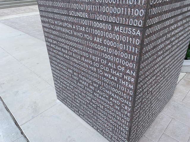 A six marble column art installation called “Opening Minds,” designed by Brad J. Goldberg, graces the front of the building. The columns feature famous quotes and titles from American and World history and binary code representing the intermingling of the traditional and digital world. This installation reinforces the Library’s vision of opening minds to a world of unlimited possibilities.
